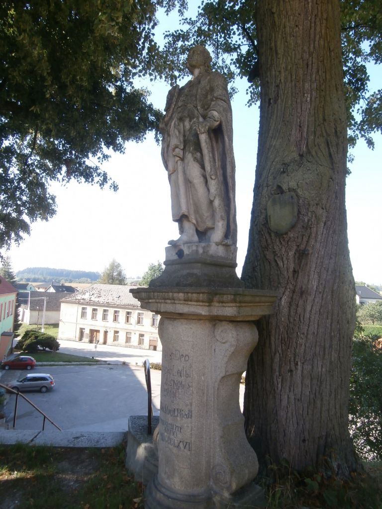 Od roku 1779 stojí před kostelem dvě vápencové sochy na žulových podstavcích. Podstavce jsou vysoké 180 cm a sochy samotné jsou vysoké 185 cm. Jedna ze soch představuje Jana Nepomuckého a druhá Judu Tadeáše. Obě mají svoji historickou hodnotu a společně s jejich osazením zde byly vsazeny ve stejném období obě lípy. Ty jsou dnes památkově chráněny. V roce 2008 byly obě sochy nově restaurovány.