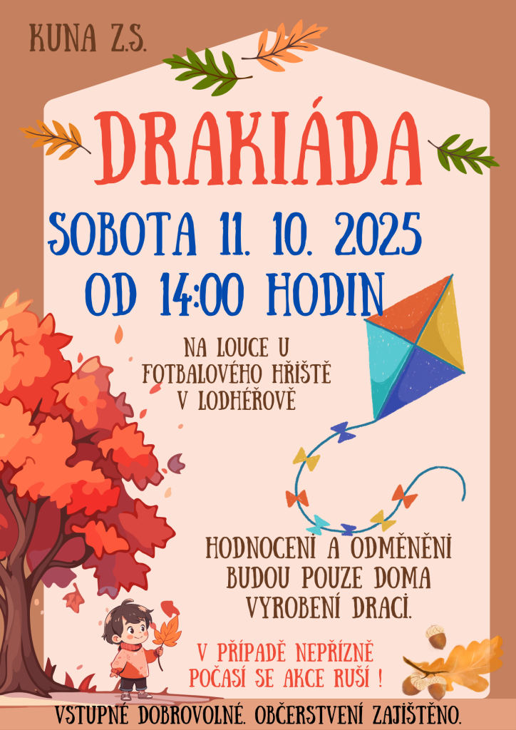 Zveme vás na DRAKIÁDU, které se koná v sobotu 11. 10. 2025 od 14:00 hodin. Akce proběhne na louce u fotbalového hřiště v Lodhéřově. Přijďte se podívat na vyjímečné draky a užít si příjemné odpoledne plné zábavy. Občerstvení bude zajištěno. Vstupné je dobrovolné.
